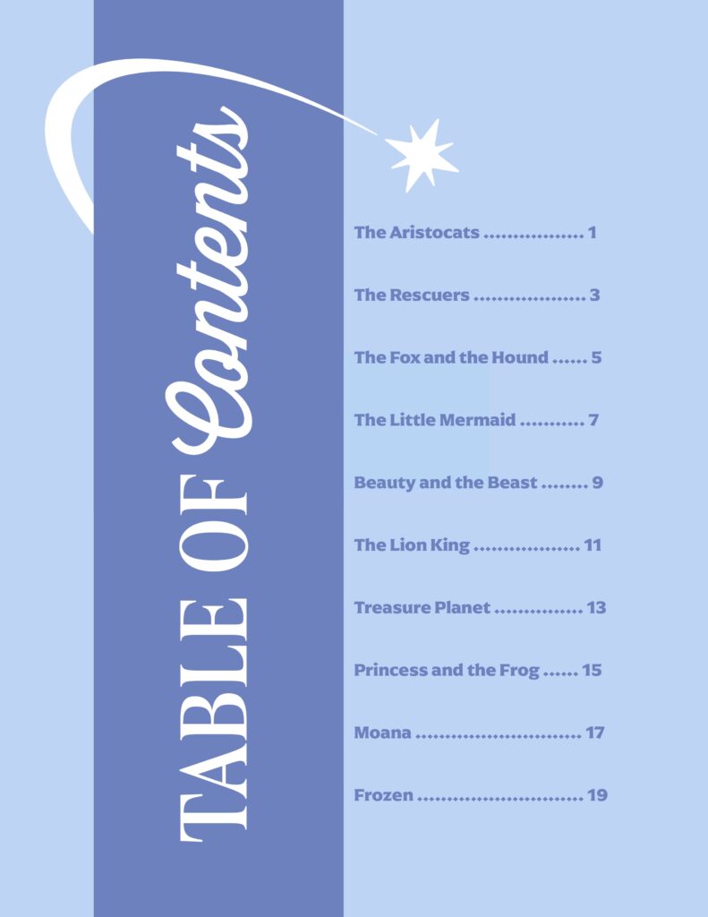 Considering that the theme was Disney, I wanted the feel of my pamphlet to be child-like, friendly, and easy to read. I wanted to stick with the blue theme for the cover and table of contents, and incorporate the iconic Disney castle without the risk of copyright, as well as the shooting star.